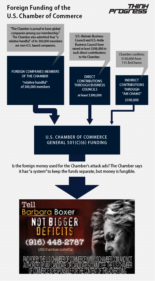2) Are the foreign funds being directed into the same general account that is used to pay for partisan attack ads? Again, the Post’s Greg Sargent pressed on this point. The Chamber, which is running more than $10 million in political advertising just this week (the largest expenditure in one week by an outside group), said, “We are not obligated to discuss our internal accounting procedures.”